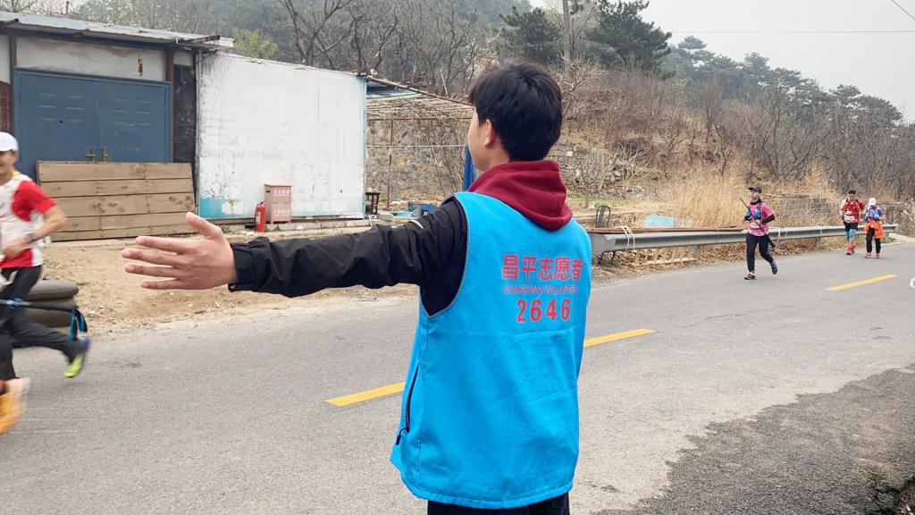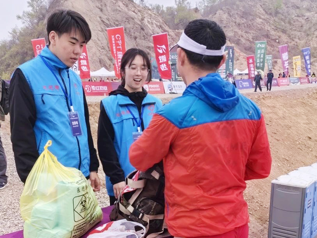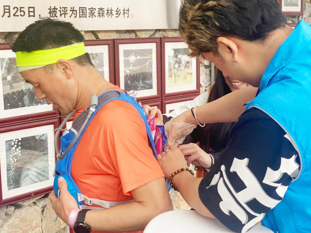 赛事当天,在越野赛道区域,志愿者们为选手提供道路指引;搬运摆放补给品,并向参赛选手进行发放;起终点,志愿者们热情地为选手呐喊助威,及时配合体能不支的选手开展帮扶和救助,他们用言语和行动向参赛选手们提供最有力的支持和鼓励。