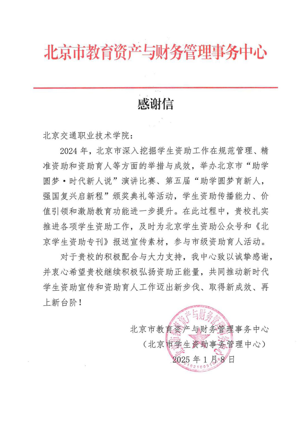 近日,我院收到北京市学生资助事务管理中心发来的感谢信。感谢学院对学生资助工作的高度重视和大力支持,肯定了我院2024年度的学生资助工作,对积极参与北京市资助育人、资助宣传工作表示感谢。对我院扎实推进各项学生资助工作、积极参与市级资助育人活动作出的贡献提出表扬。