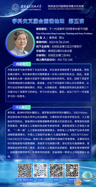 vwin德赢ac米兰官方网焦李成院士受陕西省空间超限探测重点实验室邀请,将于2023年2月28日(周二)下午在vwin德赢ac米兰官方网北校区主楼三区237报告厅开展题为《下一代深度学习的思考与若干问题》的讲座报告。欢迎广大教师前来聆听交流!