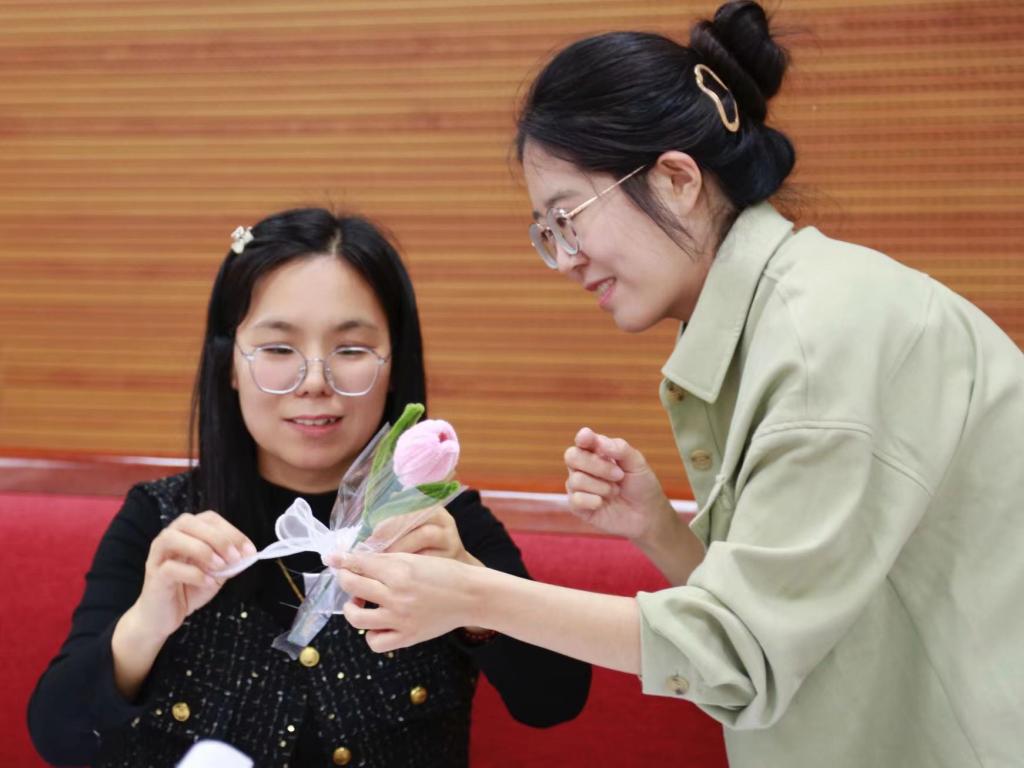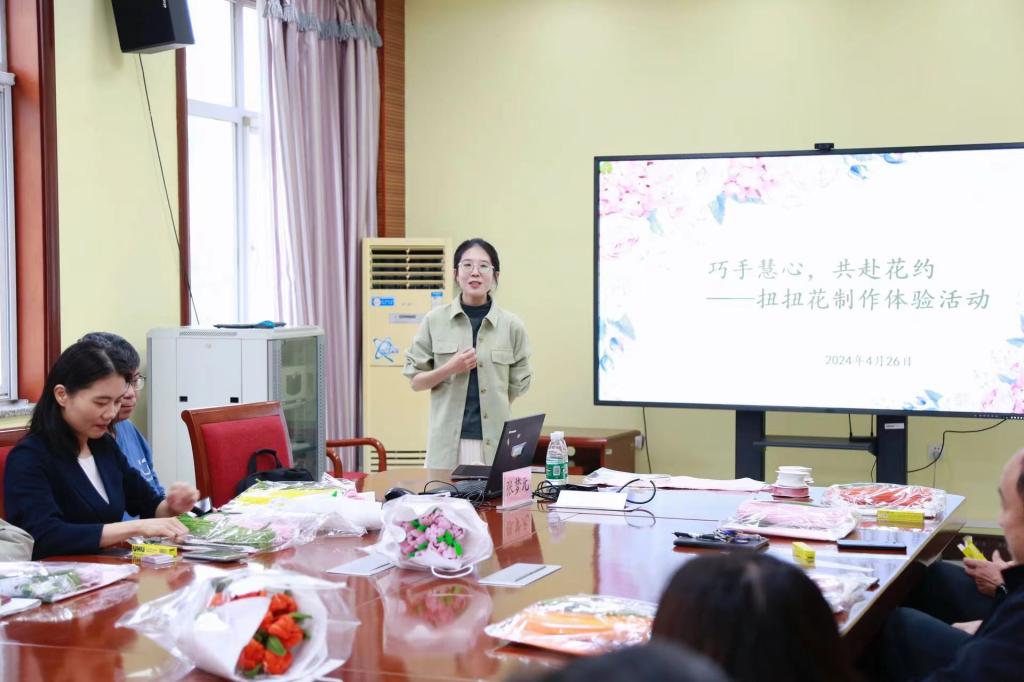 4月26日,学院心理健康教育中心张梦元老师,用艺术疗愈的方式,指导大家如何舒缓工作、生活等方面的压力。张老师组织大家现场填写压力自评量表,了解自己目前的压力程度,并从心理学角度分析“为什么春季容易有情绪问题”,紧接着教授大家如何通过制作扭扭花来缓解焦虑情绪,大家在轻松愉悦的氛围中享受艺术带来的疗愈成效。