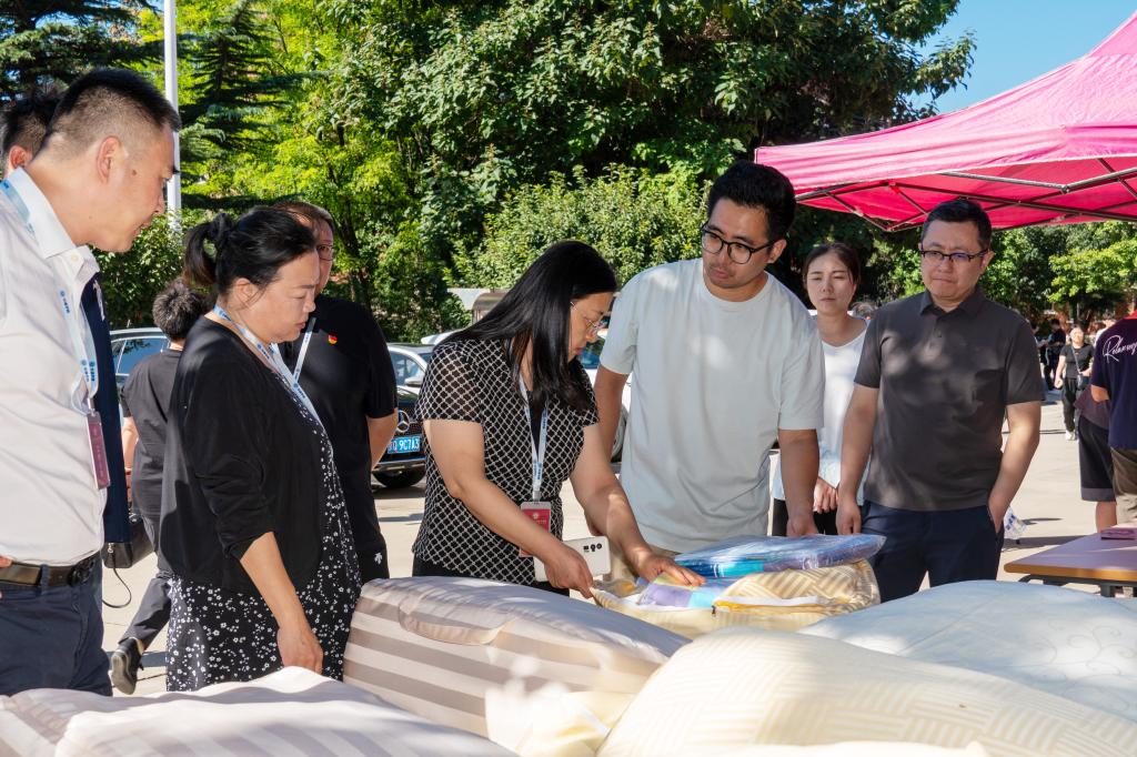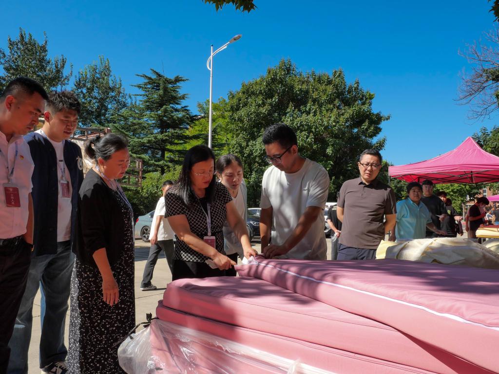 领导们仔细查看被褥、询问材质