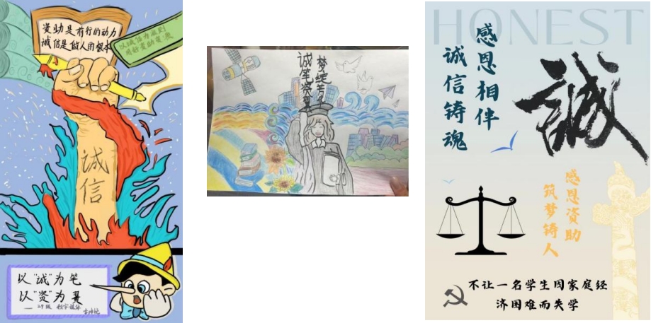 文化节还举办了“以‘诚’为笔绘诚信,以‘资’为翼筑梦想”作品征集比赛。通过鼓励同学们围绕诚信、励志、资助主题,以短视频、手绘海报、电子海报等形式进行创作,为同学们搭建了创意表达平台,引导学生主动发现、思考并艺术化呈现身边的诚信、励志与资助故事,实现自我教育与朋辈引领。