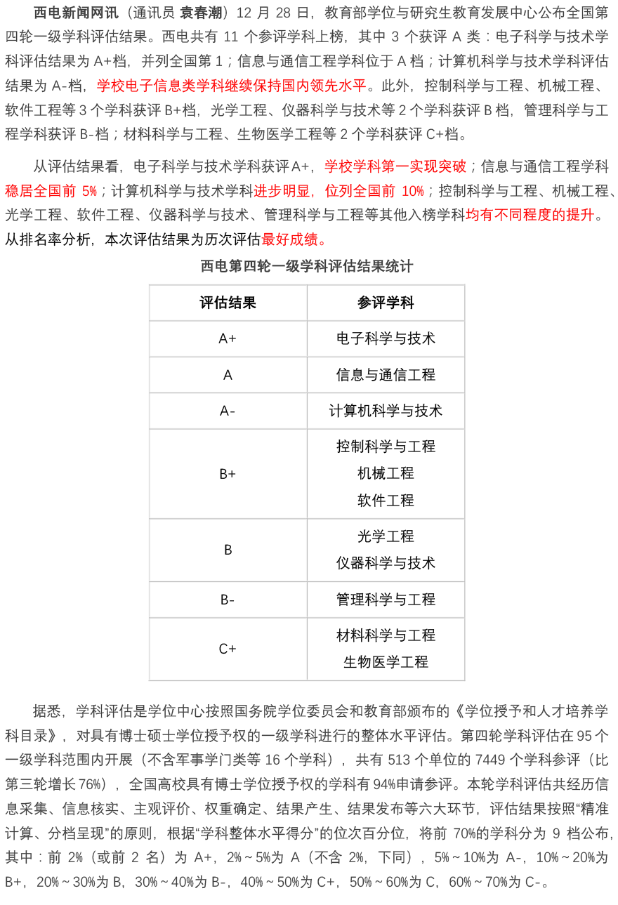 西电3学科在全国第四轮一级学科评估中进入A类