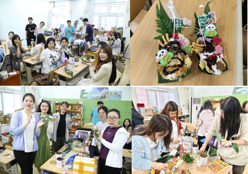 活动正式开始,心理中心的张老师化身“文化使者”,带领大家追溯端午来源及深厚的传统文化的内涵与独特魅力。紧接着,最令人期待的创意 DIY 环节闪亮登场!心理中心准备的物料堪称“豪华套餐”软糯的紫米、绵密的动物奶油、造型可爱的樱花饼干与小熊饼干、酥脆的黄油脆片、香甜的奥利奥,还有色彩缤纷的果酱与巧克力酱、绵密的芋泥、萌趣十足的熊猫粽子软糖,同时配有端午小插旗、三色绣球话、清香木、羊齿叶加以点缀。在如此丰富的物料及装饰加持下加持下,师生们灵感如泉涌,一个个造型精美、口味独特的创意粽子新鲜出炉,不仅颜值超高,更是美味十足。而 “咸甜永动机” 吃法更是引爆全场,咸味虾片与甜粽的奇妙组合,碰撞出别样风味,更有“美食冒险家”使用辣条,创造出咸甜辣交织的全新口味,引得众人纷纷围观、争相尝试。现场惊叹声与欢笑声此起彼伏。