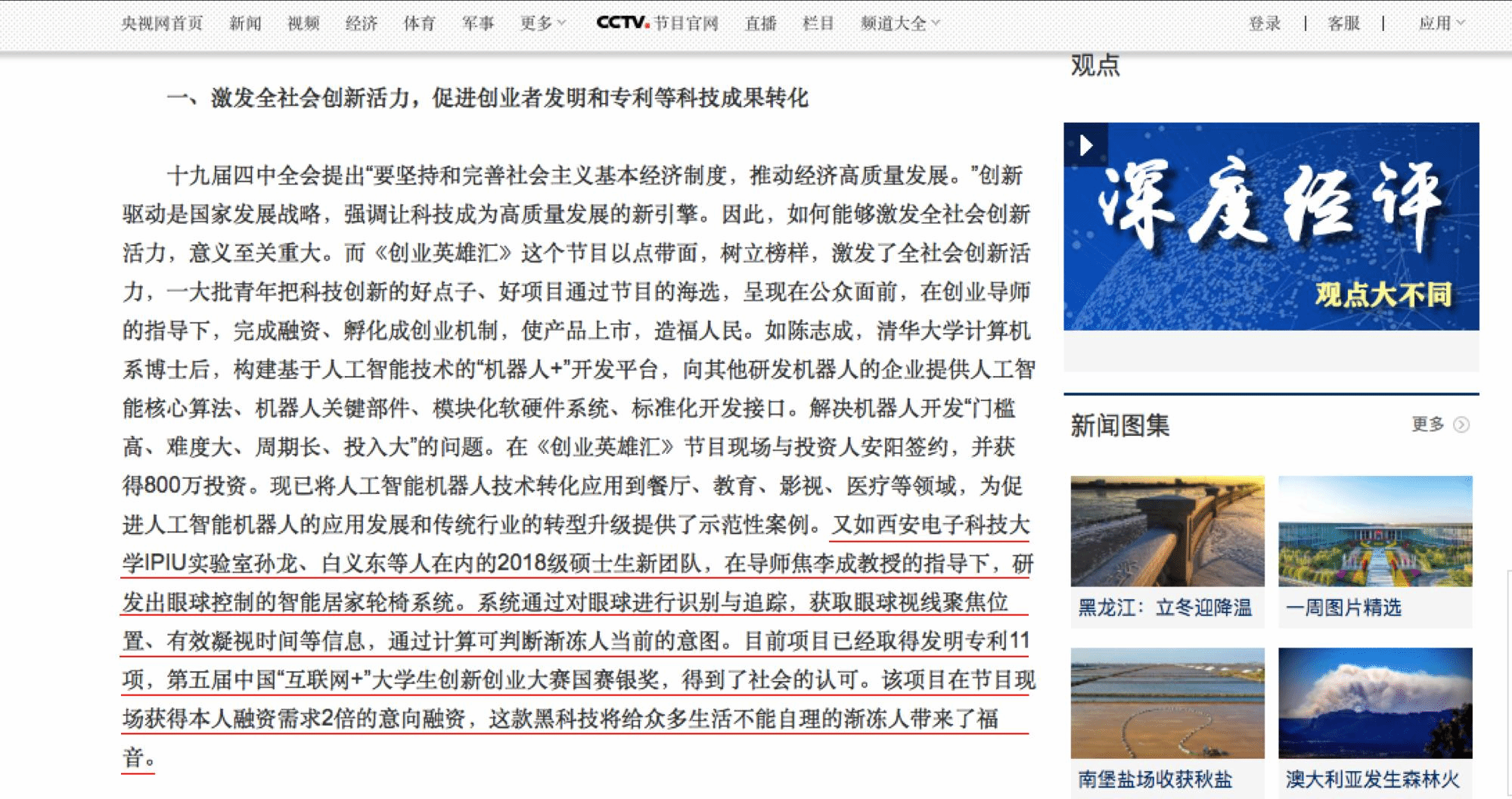 《创业英雄汇》栏目作为央视财经频道改版案例,在央视网分享节目经验中选取了四位创业者,以他们的创业经历为例,分享他们的创业故事,来激发全社会的创新活力,眼控轮椅创始人孙龙就在其中。“vwin德赢ac米兰官方网智能感知与图像理解教育部重点实验室孙龙、白义东等人在内的2018级硕士生新团队,在导师焦李成教授的指导下,研发出眼球控制的智能居家轮椅系统。系统通过对眼球进行识别与追踪,获取眼球视线聚焦位置、有效凝视时间等信息,通过计算可判断渐冻人当前的意图。目前项目已经取得发明专利11项,第五届中国“互联网+”大学生创新创业大赛国赛银奖,得到了社会的认可。该项目在节目现场获得本人融资需求2倍的意向融资,这款黑科技将给众多生活不能自理的渐冻人带来了福音。”央视网站这样写道。