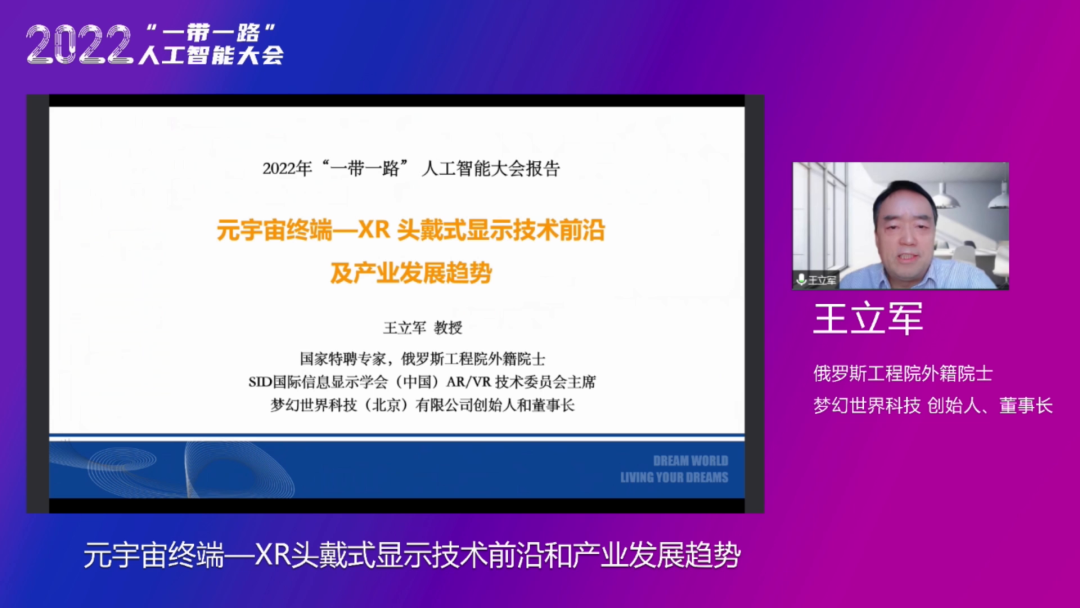 俄罗斯工程院外籍院士、梦幻世界科技创始人、董事长王立军教授从多个角度系统阐述了作为元宇宙接入和交互终端的XR头戴式(HMD)显示技术的前沿及产业发展趋势,元宇宙不仅是虚拟的世界,同时用户还可以创造,可以交易虚拟资产和买卖。王立军院士介绍,现在元宇宙的底层技术架构和软硬件和以前完全不同,不仅有PC端而且有移动端。网络基础设施已经能够支撑世界级的元宇宙,其中区块链、云计算等技术解决了基础的计算问题。元宇宙的主要特点就是通过新一代虚拟和终端在现实中实现各行各业的三维沉浸式的体验,新一代元宇宙三大最显著的特征包括:去中心化、人工智能以及通过头戴式虚拟设备实现,XR是终端设备,即扩展现实,包括AR、VR和MR,是下一代元宇宙的接入和交互终端。在未来网络端的虚拟世界与XR终端创造的沉浸式体验这两点都实现后,工业元宇宙就会实现。王立军院士梳理了目前XR终端国内产业链面临的问题和挑战,同时指出下一代微显示Micro LED技术是主要趋势,VR头戴式终端关键硬科技的核心是微显示+光学系统。同时,王立军院士表示,相信未来随着Micro LED微显示技术和衍射(全息)光波导技术的发展成熟,XR智能终端必将替代手机成为人们主要的信息交互的手段,成为未来元宇宙核心的终端和交互设备。