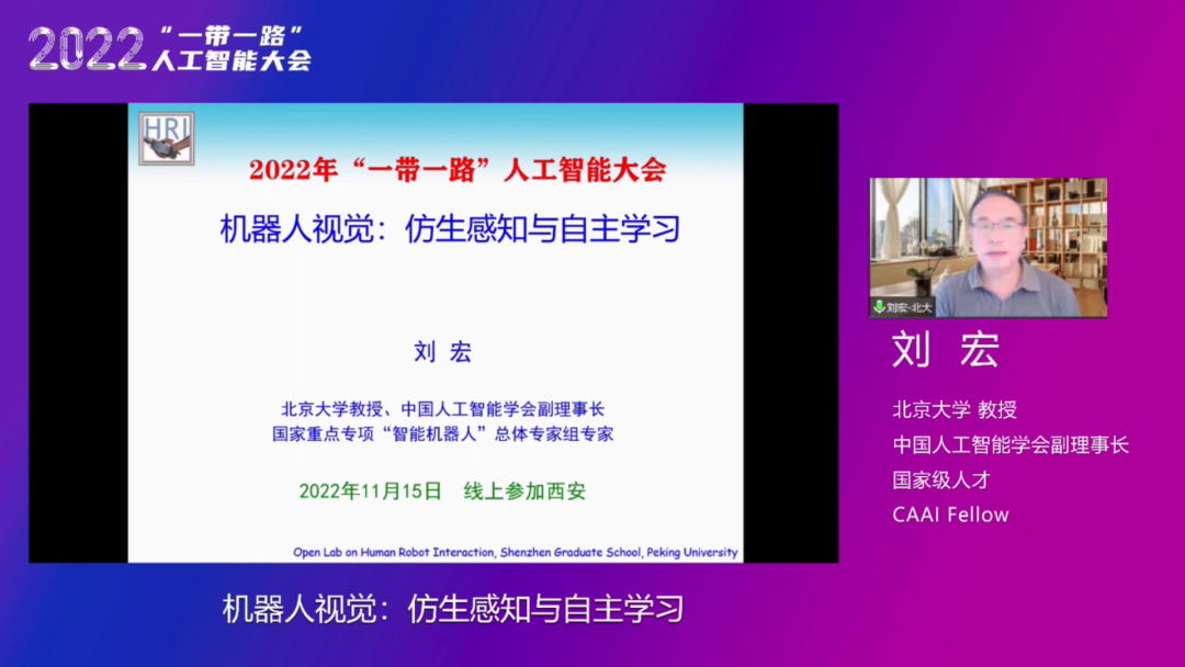 中国人工智能学会副理事长、CAAI Fellow、北京大学刘宏教授围绕《机器人视觉:仿生感知与自主学习》主题,从机器人视觉的五大挑战、仿生和自主学习、团队开展的主要研究、集成应用等内容,对机器人如何与计算机视觉结合进行深度剖析。刘宏教授从人类视觉出发,以视觉具有最自然的感知手段、拥有最好的可解释性、最好的拟人性三个特性为基础,阐释了机器人视觉的重要性以及机器人视觉与计算机视觉的区别,提出机器人视觉的五大挑战:传感器外参数随运动实时改变、运动导向的视觉感知任务、训练学习负样本少、系统的实时性和在线自主性能要求高。然后,刘宏教授对自然界多种生物的卓越的运动性能、有限的视觉能力和受限的学习机制进行讲解,对为什么要仿生和自主学习的问题进行了阐述,并对目前现有的仿生感知机制和自主学习机制进行了总结,提出了机器人视觉仿生感知与自主学习的技术路线,希望在此基础上探索更通用的“运动智能”模型。刘宏教授也介绍了团队目前所开展的研究,通过视定位觉与导航、工业机器人视觉、水下机器人目标识别、人体目标Re-ID、场景深度估计、复杂场景建模等方面的工作对运动本体、交互物体、互动人体、动态环境感知方面的研究进行深度剖析。最后,刘宏教授详细介绍了新一代智能导购机器人系统,将新一代AI与公共服务机器人有机融合,展示了创新成果的集成应用及其优势,同时也提出了对机器人视觉发展的进一步思考。
