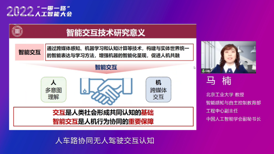 中国人工智能学会副秘书长、北京工业大学马楠教授的报告从以下四个方面展开:第一,人车路协同无人驾驶交互认知的研究意义。马楠教授指出,智能交互就是通过跨媒体感知、机器学习和认知计算等技术,构建与实体世界统一的智能表达与学习方法,增强机器的智能化呈现,促进人机共融。交互是人类社会形成共同认知的基础,那么智能交互就是人机行为协同的重要保障。第二,人车路协同无人驾驶交互认知组成及基础架构。马楠教授团队长期聚焦感知交互,重点研究面向无人车感知数据跨模态融合的交互架构,开发了“人车路协同无人驾驶云智能交互系统”,助力无人车商业推广,努力改变用车生态。除此之外,团队还研发了东风Sharing-VAN无人车智能交互与编队控制系统、无人驾驶BUS云智能交互系统、基于超视距感知及V2X无人驾驶交互系统(智能编队)等。第三,无人驾驶交互认知的研究与应用。面对基于在信息嵌定情况下如何更好地感知数据的问题,团队开发了多视角多模态数据获取与处理及在交互认知中的应用。为了更好实现信息感知与智能交互,团队开发了基于时空特征的连续手势识别及在特定场景中的应用。另外,团队还设计了车体语言及环境交互,实现智能车的车道跟随控制。除此之外,人车路协同无人驾驶智能交互算法在国际、国内赛事也得到了验证。第四,智能交互技术产学研建设。马楠教授团队围绕着新形态教材、实践教学案例及教学载体、虚拟仿真实践平台建立了一系列的新课程。另外,团队还开发了虚拟仿真的实践教学平台和其他新型态教材,围绕着无人驾驶、智能交互云端的数据库系统,撰写并出版了《数据库系统智能应用》教材。