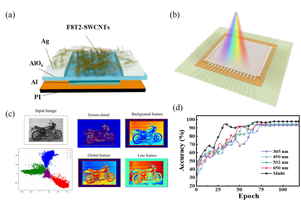 近日,vwin德赢ac米兰官方网吴金建教授与中国科学院苏州纳米所赵建文研究员、香港大学Li Lain-Jong教授合作,在高性能光电神经形态器件以及基于硬件的脉冲神经网络算法方面取得了重要的学术成果。这一成果发表在《Advanced Science》(一区,IF=15.1),是德赢官网师生首次在该国际顶级期刊发表的论文,题为Photoprogrammed Multifunctional Optoelectronic Synaptic Transistor Arrays Based on Photosensitive Polymer-Sorted Semiconducting Single-Walled Carbon Nanotubes for Image Recognition,vwin德赢ac米兰官方网姬怡希硕士与苏州纳米所隋念梓博士等为共同第一作者,吴金建教授、赵建文研究员、Li Lain-Jong教授为共同通讯作者。