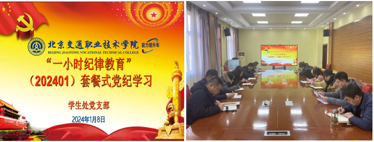 为深入学习贯彻习近平新时代中国特色社会主义思想,全面贯彻落实习近平总书记提出的一系列关于基层治理工作的重要论述、重要讲话和重要批示,深入理解新时代“枫桥经验”的内涵。同时教育引导党员干部加强作风建设,严明纪律规矩,坚持廉洁底线, 2024年1月8日上午,学生处党支部在办公楼一层会议室召开专题学习会和“一小时纪律教育”党纪学习会,支部全体党员参会。