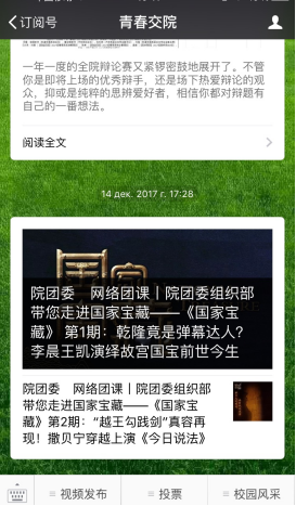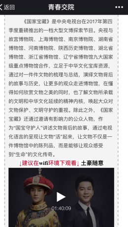 为提升全院团学干部和团学青年的思想政治水平,让更多的同学走进博物馆,在懂得如何欣赏文物之美的同时,了解文物所承载的文明和中华文化延续的精神内核,唤起民众对文物的保护,文明守护的重视。我院团委组织部12月14日在团委官方订阅号中发布于了《文化传奇之国家宝藏》网络团课。