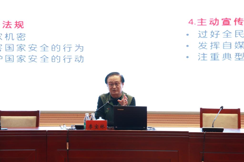 李宝林少将对总体国家安全观进行了深入的解读,他强调,“总体国家安全观涉及二十个重点领域,随社会发展不断动态调整,安全观内涵在不断延伸。”他号召师生们要加强学习,准确把握总体国家安全观的内涵;提高站位,领悟总体国家安全观的精神实质;见微知著,通过强化爱国情怀,遵守国安法规,提升防范能力,主动宣传引导的方式自觉践行,为国家安全做出贡献。