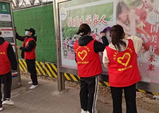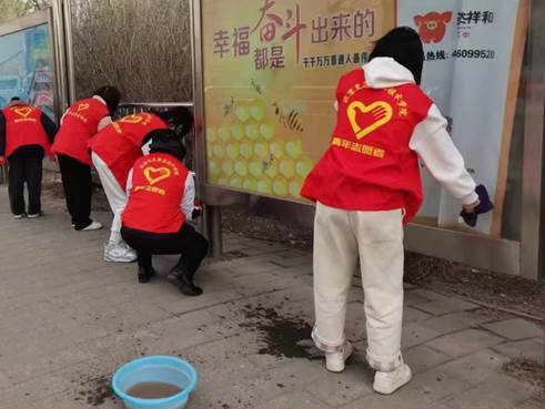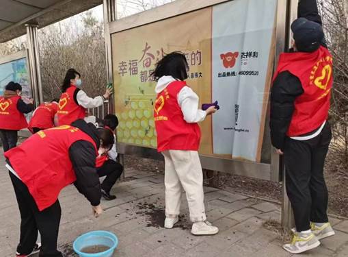 弘扬雷锋精神,践行志愿服务,擦靓公交站台,擦亮城市之窗。为弘扬新时代文明风尚,响应习近平总书记就学雷锋精神多次做出的重要指示,丰富我院校外志愿服务活动,增强团的社会功能,2022年3月,学院团委开展“学习雷锋精神主题系列活动”——“环保清理和谐出行”活动,青年志愿者协会组织来到学校附近的公交站点清洁公交站牌、公共座椅和车站卫生环境。