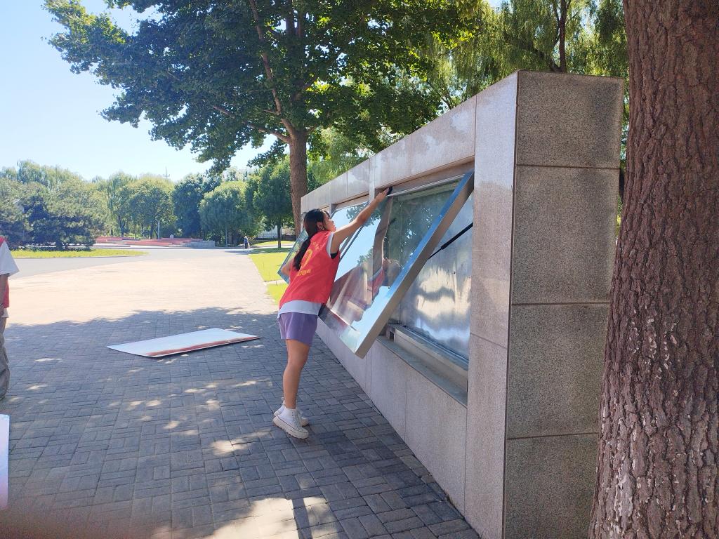 校园橱窗是校园文化宣传的重要媒介,是学生获取资讯的窗口,是教育引导师生的重要宣传阵地,更是彰显全校精神风貌、交流思想文化的一扇窗户。在橱窗前,学生干部身穿青年志愿者者协会红色马甲热情洋溢的进行清洁工作,使用水桶、刷子、报纸、抹布、钢丝球等清洁工具,分工明确,配合默契,认真清理了校园橱窗和宣传展板上的灰尘、污渍以及胶带印记。尽管头顶着炽热的阳光,也都认真的完成各自的清洁工作。