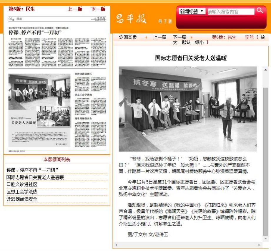 在第31个“国际志愿者日”来临之际。院团委、院青年志愿者协会、院红十字会于12月2日下午一同举办了“关爱老人,弘扬中华文化”主题活动。本次活动,也受到了昌平电视台和报社相关媒体的高度关注。