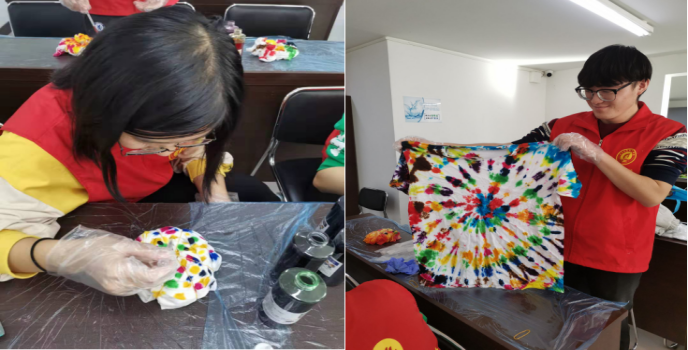 首先老师老师为大家讲解了扎染T恤的方法,要拿起T恤扎染的中间部分,用2根绳子把T恤捆成3段,然后给每部分涂上不同的颜色。同学们尝试着各种方法在T恤上进行着创作,色彩像被施了魔法一般“跑”到了每一件T恤杉上。历时两个多小时,一幅幅五彩缤纷的抽象画作品相继诞生。每位学生都是那么的投入,每张作品都那么的生动创新,整个活动过程同学们脸上都洋溢着快乐又透着成就感的笑容。