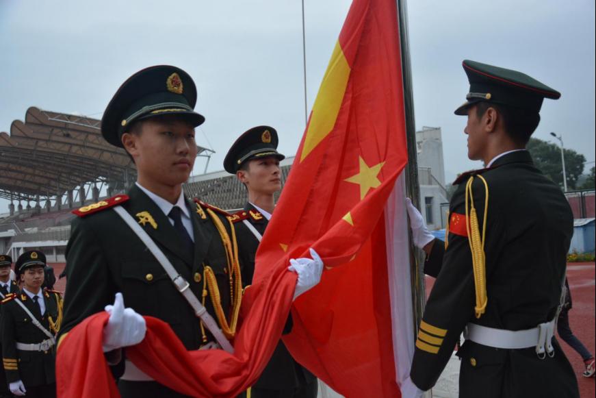 各位国旗班队员身着常服,穿戴整齐,精神抖擞的庄严的挺立在国旗台前,伴随着升旗号令的下达,“敬礼!”指挥手气势恢宏的喊出口令,升旗手干净利落的抛出国旗,鲜红的五星红旗伴随着《义勇军进行曲》在微风中飘然升起。为了确保此次升旗典礼的圆满完成每个国旗班队员在开学后进行了一段时间的特殊集训他们怀着对祖国、国旗的敬爱,在操场上一遍遍踢着正步,全神贯注地练习着,直到符合标准.
