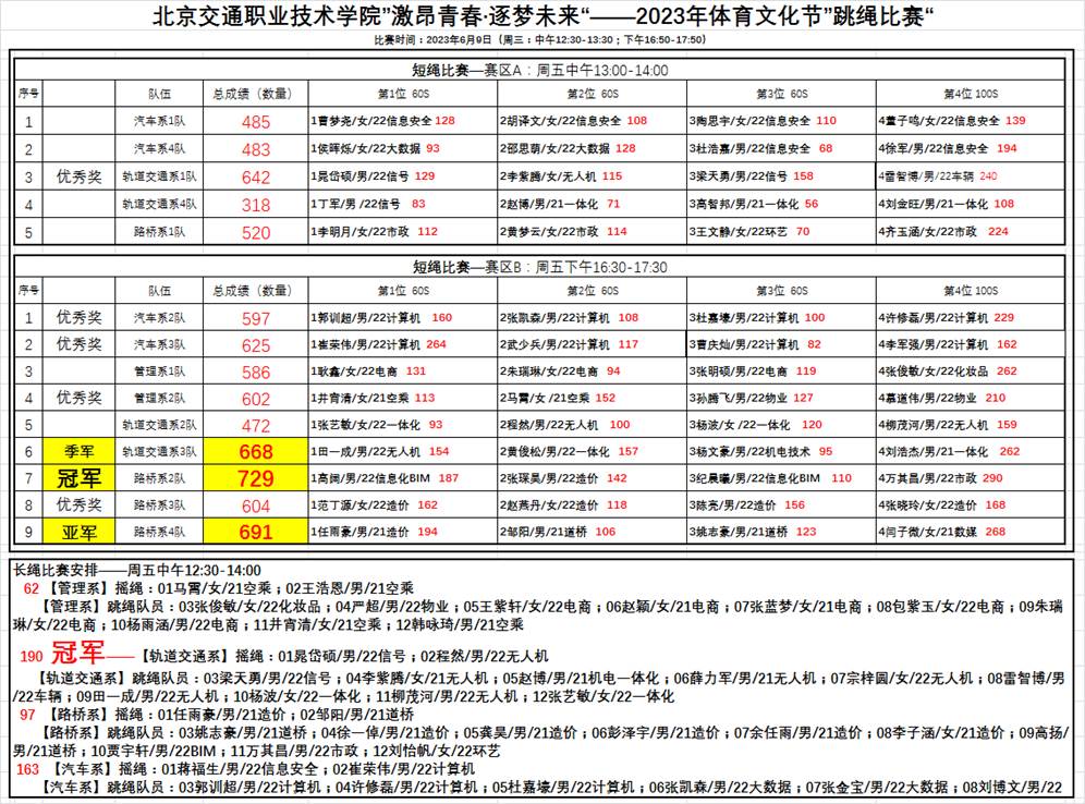 飒爽英姿展风采,同心协力勇争先。为丰富学生校园文化生活,提高团队协作能力,使学生牢固树立健康第一的理念,提高学生身体素质和运动技能水平,加强学院体育文化节品牌活动建设,2023年6月9日,由学院团委主办,院学生会信息部承办的“激昂青春•逐梦未来”体育文化节——团体跳绳比赛在学院篮球场南侧活动区圆满举行。