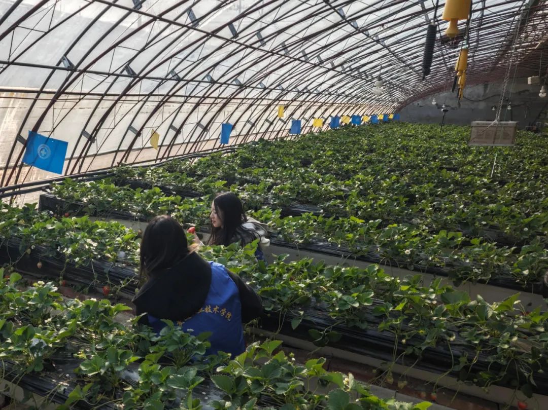 在座谈会后,合作社负责人崔维国带领两校师生参观了占地100亩的智慧大棚。崔维国老师对草莓品种、培育技术、监测设备以及产量进行了详细介绍。同学在品尝草莓的同时,更直观感受到了现代农业的魅力以及乡村振兴政策为老百姓带来的利好。 随后,我院师生在负责人的带领下还参观了园区里的多肉大棚以及“动物乐园”,同学们在投喂鸵鸟、抚摸牛羊的过程中,切身感受生态农业的人文温度。