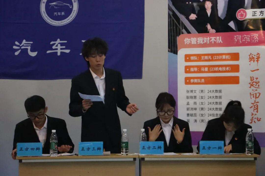 决赛现场,双方围绕“00后整顿职场是进步还是鲁莽”展开激烈交锋。正方“你管我对不队”以“职场革新需要青年力量”为切入点,从00后的规则意识、创新思维出发,指出其敢于打破陈规的行动是推动职场生态优化的进步之举;反方“竹子批发队”则立足“职场现实与责任担当”,强调00后在经验不足的情况下贸然“整顿”,可能导致团队协作效率降低,实为鲁莽之举。质询环节中,双方辩手紧扣核心论点,攻防转换行云流水。正方三辩以近年职场维权案例为据,犀利追问反方“如何界定进步与鲁莽的边界”;反方二辩则以“职场秩序维护”为矛,反问正方“个人诉求是否应凌驾于集体规则之上”。自由辩论阶段,双方更是针锋相对,现场金句频出,掌声不断。总结陈词时,正反方四辩分别以“青年责任”与“理性实践”为落脚点,逻辑缜密地升华观点,引发观众深思。最终,汽车系“你管我对不队”凭借严谨的逻辑架构与出色的临场应变,摘得本届赛事桂冠;路桥系“竹子批发队”荣获亚军。“竹子批发队”四辩张傲同学以清晰的逻辑与感染力十足的陈词,荣获“最佳辩手”称号。