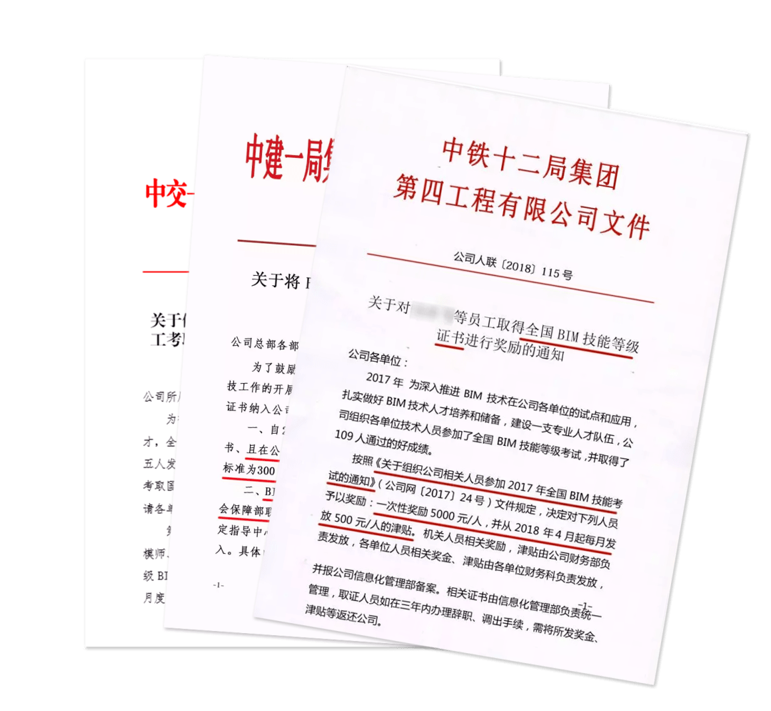 BIM一级及二级(教育部、中国图学学会、中国建设教育协会)、注册建造师、注册造价师等。企业发布BIM资格证书奖励标准,每月补贴300元到一次性补贴5000元不等,学生在校取得BIM证书,工作即享受加薪。