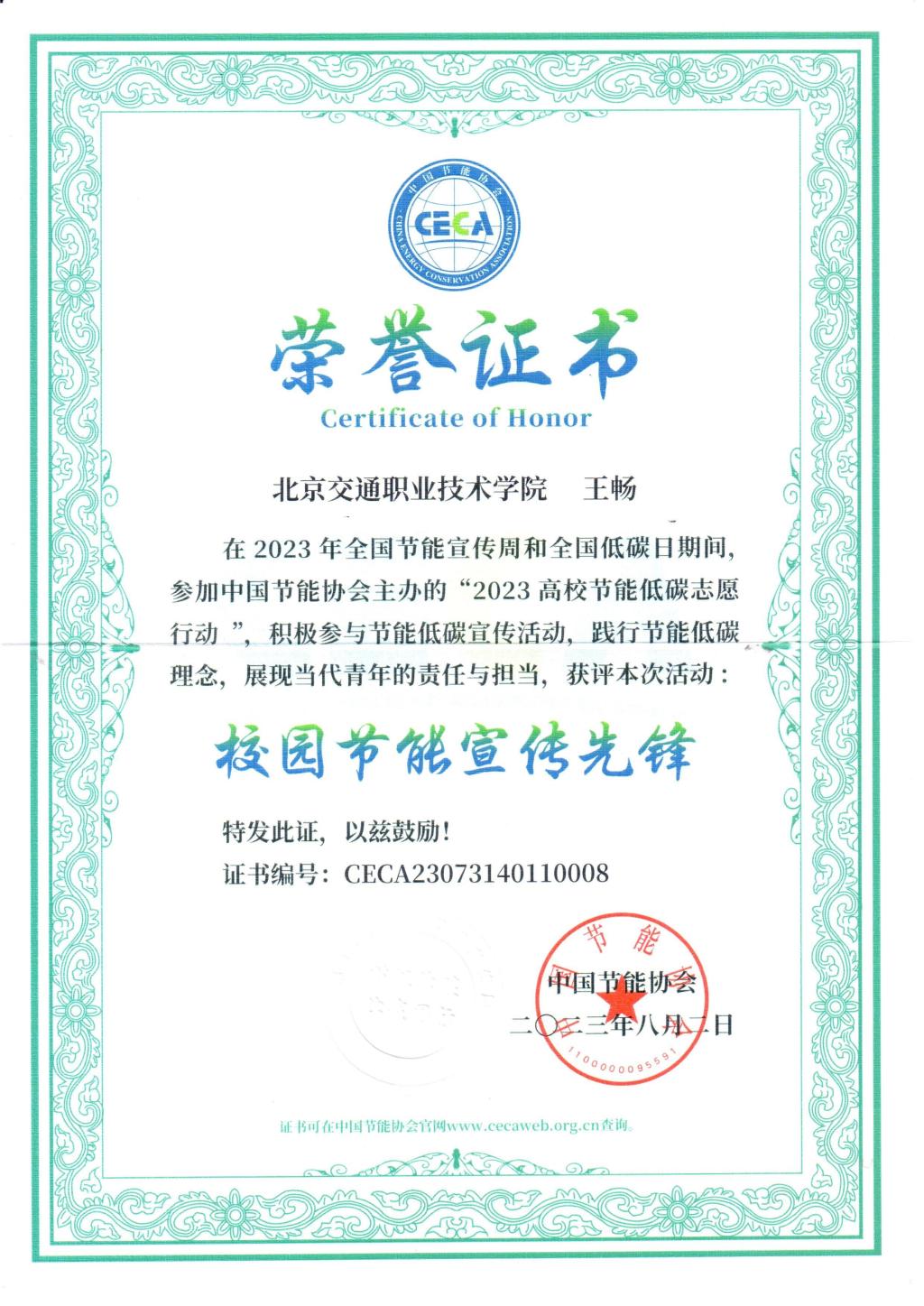 在此期间,王畅同学以节能低碳为主题创作了平面设计作品,并投入3小时志愿时长,荣获本次活动“校园节能宣传先锋”荣誉证书以及“志愿者证书”。