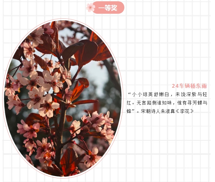 为深入贯彻落实德智体美劳“五育并举”育人理念,激发青年学子传承文化、创新实践的热情,轨道交通系于4月3日至14日成功举办“春日诗韵映繁花”春日花卉摄影与诗句融合大赛。活动以“撷春日繁花光影,品千年诗意芳华”为主题,通过镜头与诗句的碰撞,展现当代青年的文化自信与艺术创造力。