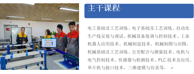 电工基础及工艺训练、电子基础及工艺训练、自动化生产线安装与调试、机械设备装调与控制技术、工业机器人应用技术、机械制造技术、机械制图与识图、机械基础及工艺训练、公差配合与测量技术、电机与电气控制技术、传感器与检测技术、PLC技术及应用、单片机与接口技术、三维建模与仿真等。