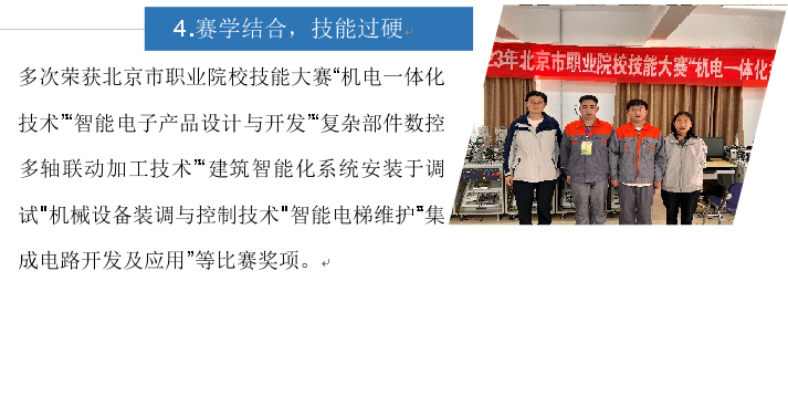 多次荣获北京市职业院校技能大赛“机电一体化技术”“智能电子产品设计与开发”“复杂部件数控多轴联动加工技术”“建筑智能化系统安装于调试”“机械设备装调与控制技术”“智能电梯维护”“集成电路开发及应用”等比赛奖项。
