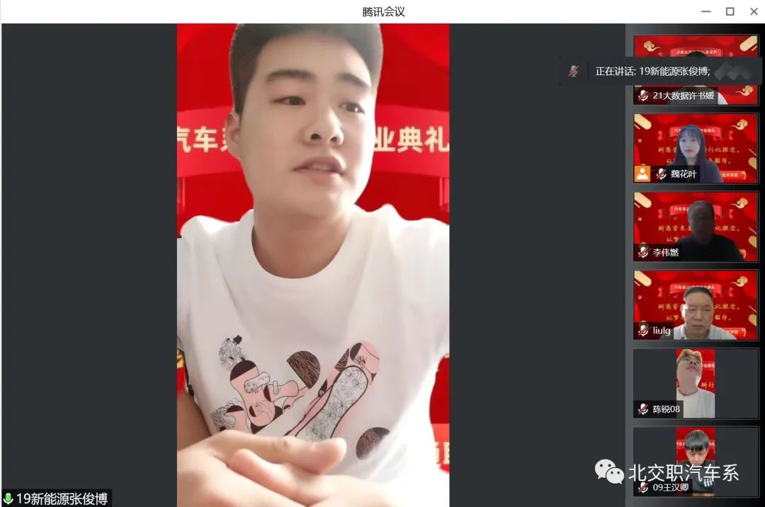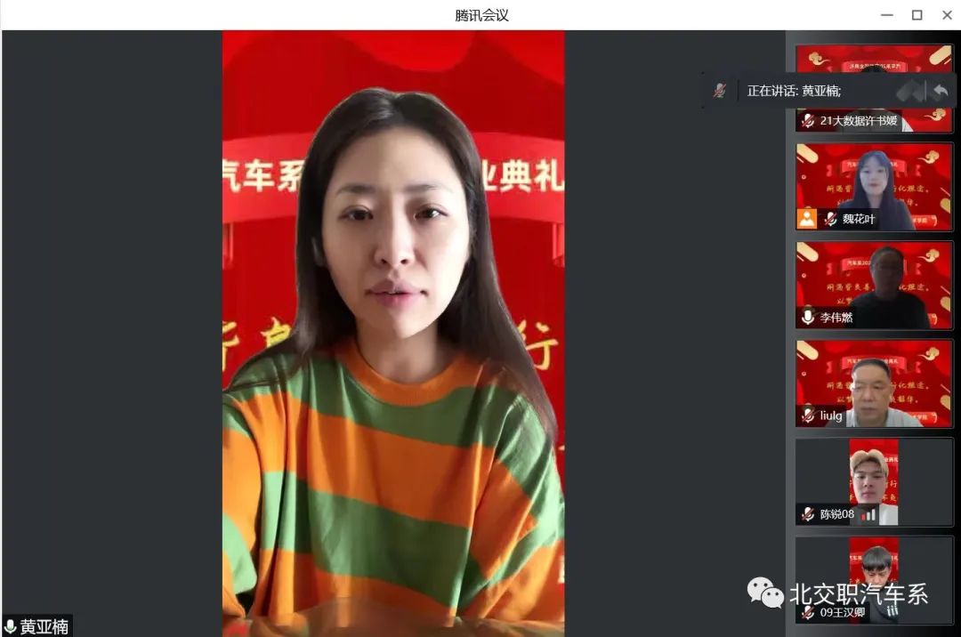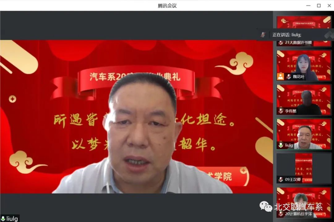 青春无悔,岁月为歌,又是一年盛夏好风景。毕业离别,情谊长存,得遇师友,深感荣幸。在这个因疫情而特殊的毕业季,7月2日上午十点,万象城娱乐awc线路汽车系2022届毕业生 “云”毕业典礼隆重举行。此次参会人员有汽车系主任刘连光老师,汽车系党支部书记李伟燃老师,汽车系班主任黄亚楠老师,汽车系计算机教研室主任姜丹老师,汽车系2019级毕业生及汽车系全体在校学生,共聚“云端”,参加了本次仪式。毕业典礼由我系党支部书记李伟燃老师主持。