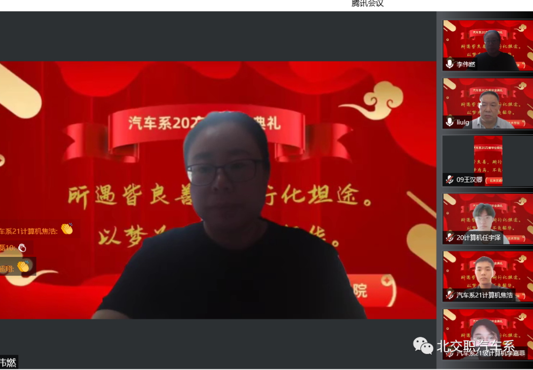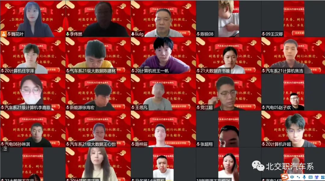 典礼在我系党支部书记李伟燃老师的主持下拉开了序幕。毕业典礼正式开始后,汽车系全体师生开启视频,云端相聚,合影留念。以热烈的掌声欢迎全体参会教师,庆祝本届毕业生圆满完成学业。