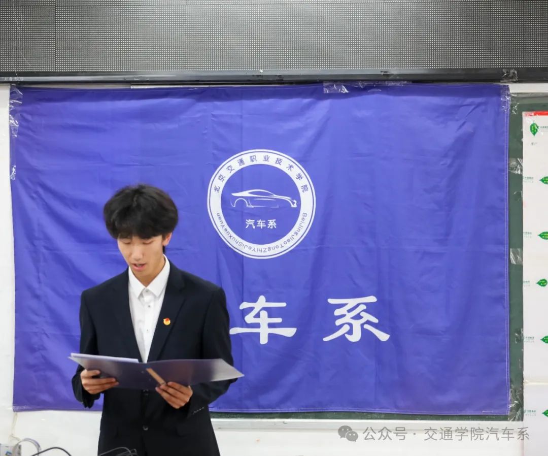 接下来由王圣洁老师宣读23级学生干部竞选结果,随后新任组织部部长靳傲宇同学代表全体新任团总支学生会成员进行发言。靳傲宇同学表示,他们作为接班人要始终保持积极态度,十足的干劲。相信在他们的带领和努力下,汽车系将迎来更好的明天,走向新的辉煌。
