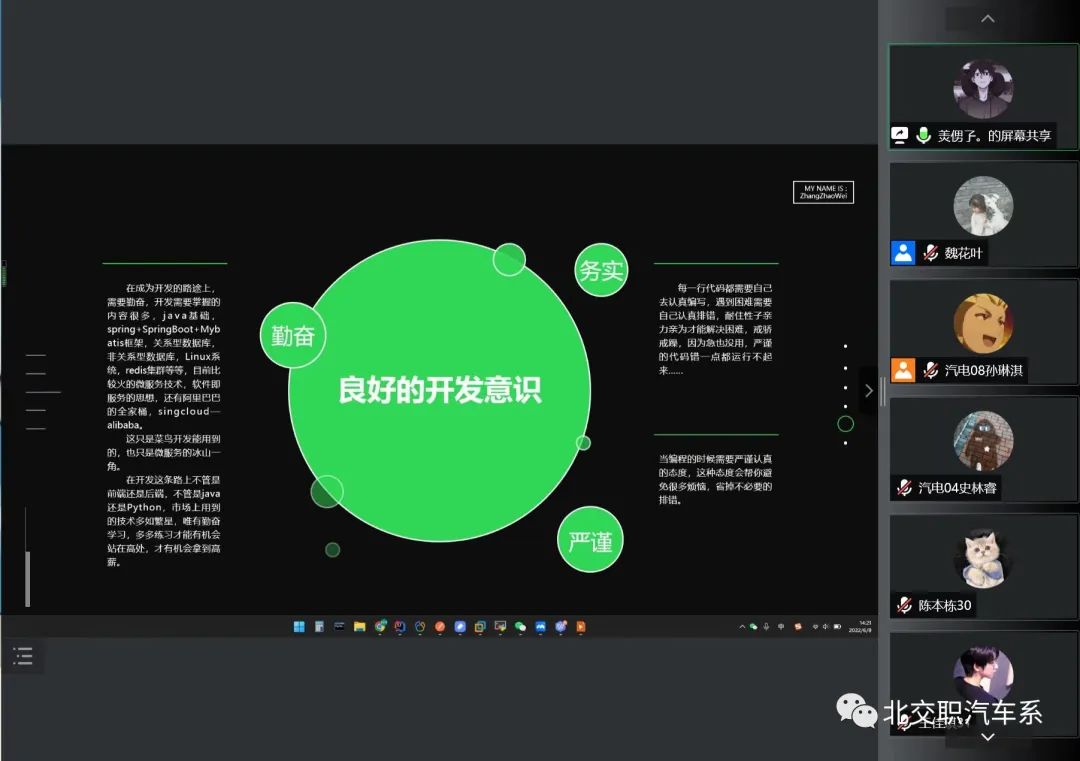 本次邀请到的学长曾担任系团总支副书记、班级团支书,他在会议上提到他在校时经常参加院里举办的各类活动和比赛,在学习之余也会积极地丰富自己的大学生活,通过这样来学习更多的技能,同时他也鼓励我们要在保证自己的学习成绩的基础上多多参加一些有意义的活动以此来丰富自己、提升自己。毕业后他经过培训顺利进入公司,现在主要负责公司内部接口的开发。