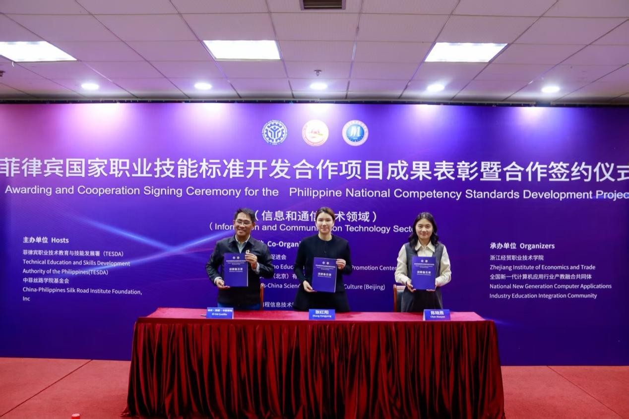 近日,菲律宾国家职业技能标准开发合作项目“信息和通信技术领域”成果表彰暨合作签约仪式在杭州隆重举行。活动由菲律宾职业技术教育与技能发展署(TESDA)、中菲丝路学院基金会共同主办,TESDA资格与标准办公室执行署长El Cid Castillo、中菲丝路学院基金会主席张红阳、菲律宾国家职业技能标准开发合作项目秘书处秘书长段建、TESDA标准认证专家以及信息通信技术领域标准制定的全国院校代表共60余人参加。我院作为菲律宾职业技能标准开发单位受邀参会。