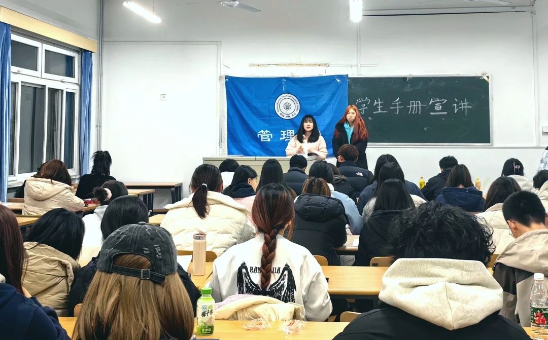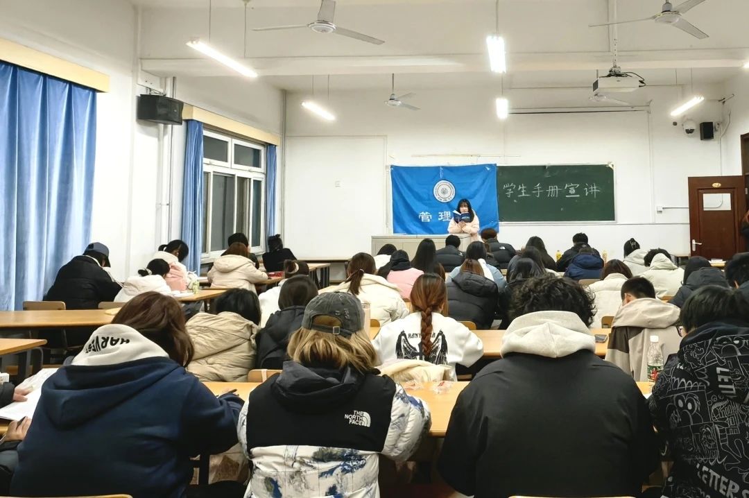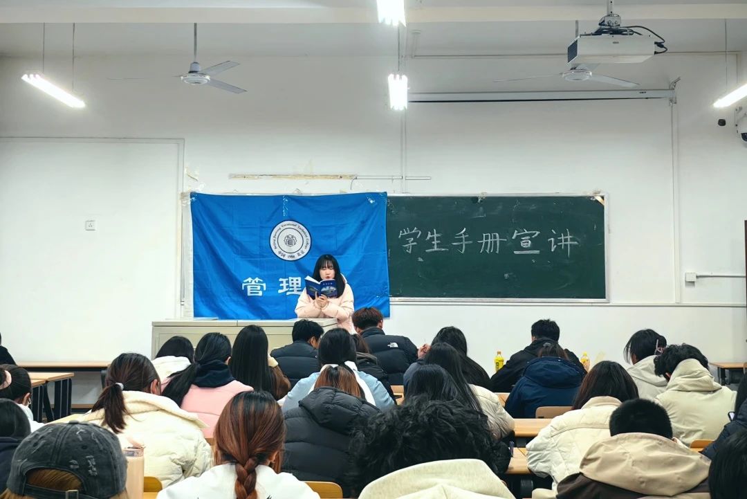 为加强新生对《学生手册》的了解,明确校规校纪,培养学生良好的行为规范和道德情操,2024年11月20日管理系于教一楼119教室召开2024级新生《学生手册》宣讲活动。