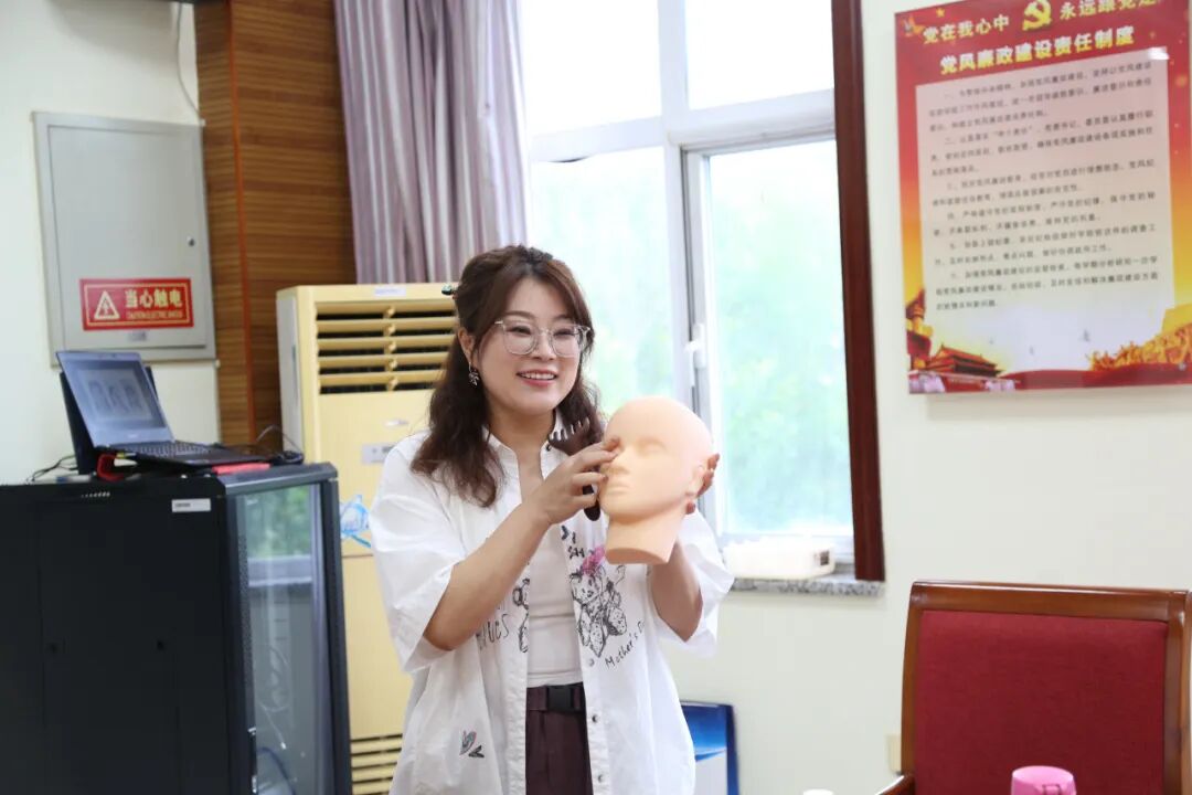 高润老师系统讲解了精油的分类、特性、护肤原理及精油调配的步骤和注意事项,并带领党员教师分组实操,亲手调配多功能的复方护肤精油,随后练习了面部刮痧手法。活动现场气氛活跃,互动频繁,体现了教师们对社会服务类课程的高度关注。