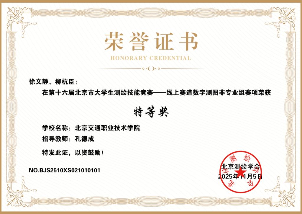 徐文静、柳杭臣荣获线上赛道数字测图非专业组赛项特等奖;