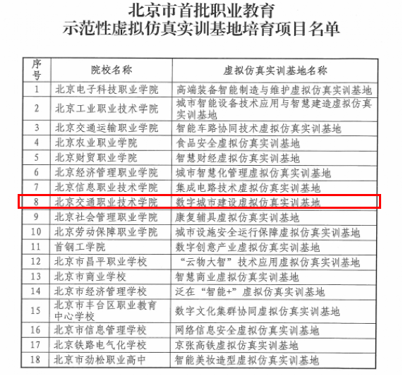 2022年4月25日,北京市教育委员会公布了北京市首批职业教育示范性虚拟仿真实训基地培育项目名单,万象城娱乐awc线路“数字城市建设虚拟仿真实训基地”名列其中。
